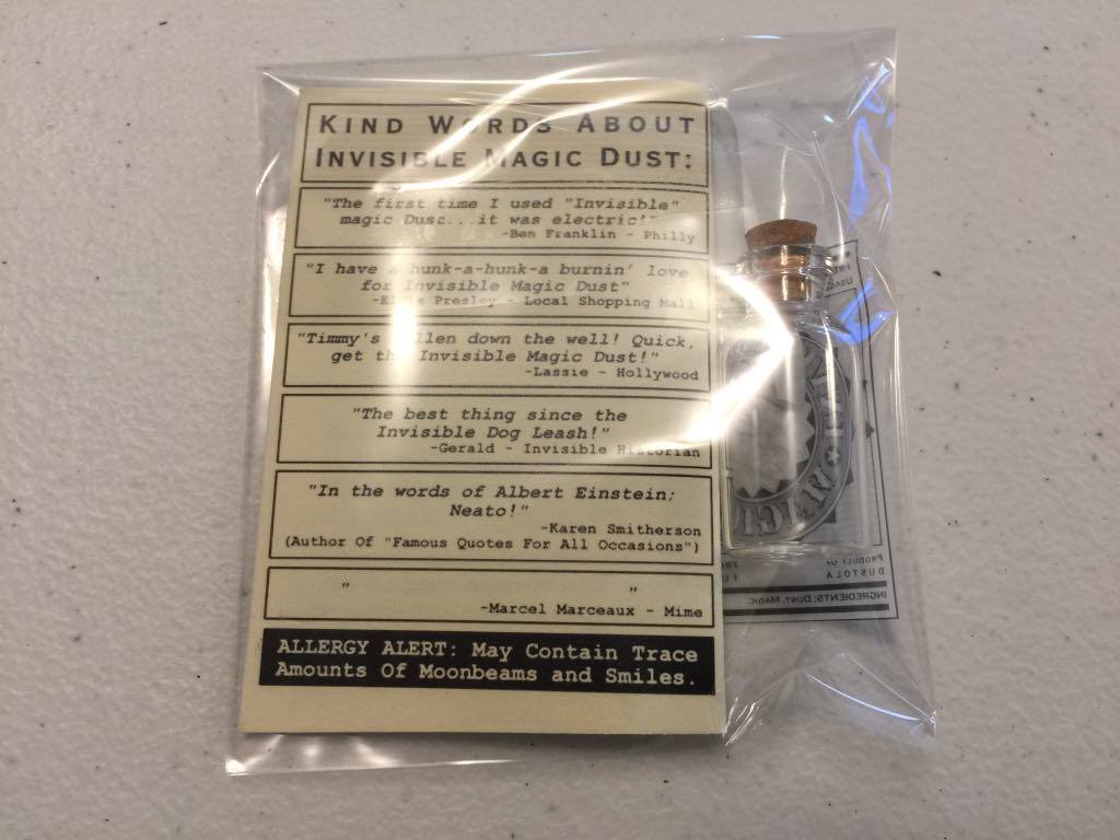 Your "EXCLUSIVE Licensed Member Version of Invisible Magic Dust!” was carefully taken from the ‘Powerful Success Solutions’ high-tech, digital storage facilities with sterilized contamination-free computer and gently placed on a velvet pillow. THEN, our crack high-tech team inspected your item to assure that it was in the best of condition before sending to you now.